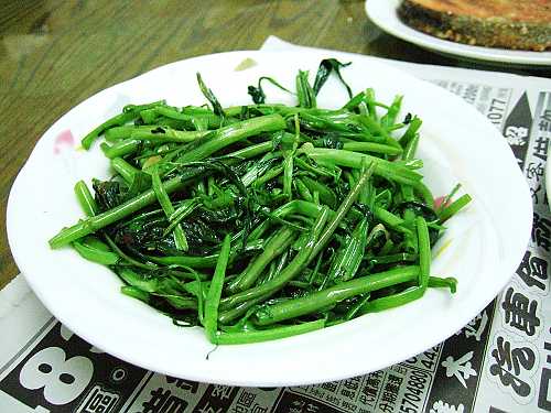 4.加入牛肉跟空心菜葉拌炒後加點鹽巴調味