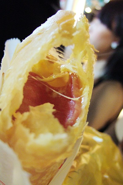 他的作法是用兩張餅皮包著餡後再下去油炸