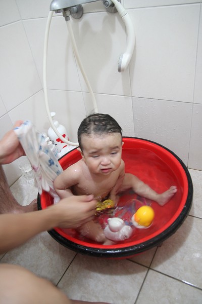 首先脫尿布~然後泡個水