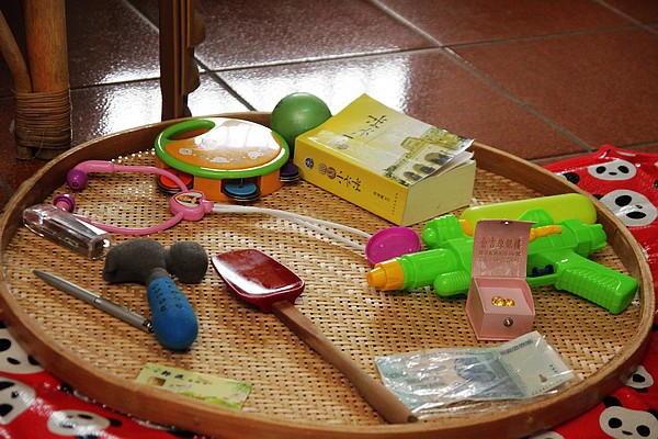 有樂器、小六法、印章、聽診器、槍、筆、工具、鍋鏟、金元寶、提款卡、現金、球等12項