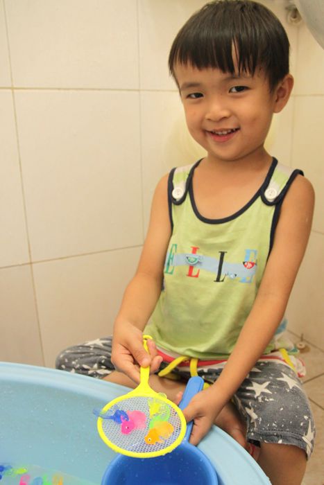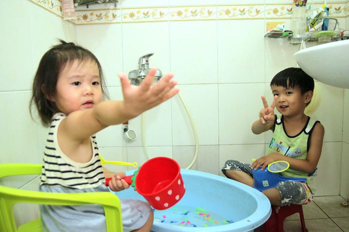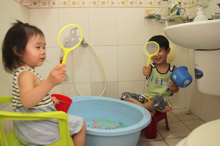 準備來去幫兩個溼答答的小孩洗澡去!!