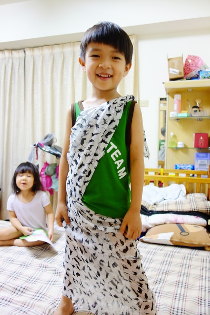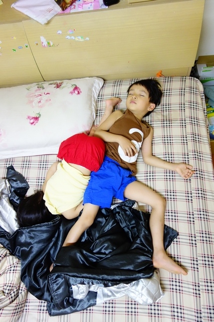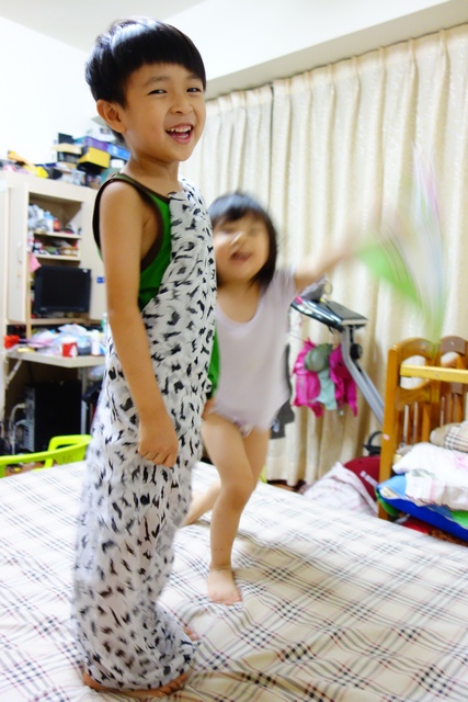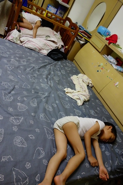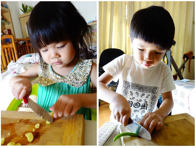 實在是外面太熱了~就讓小孩在臥室幫忙切菜吧