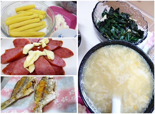 涼拌玉米筍、烤香腸、煎肉魚、燙地瓜葉、玉米濃湯