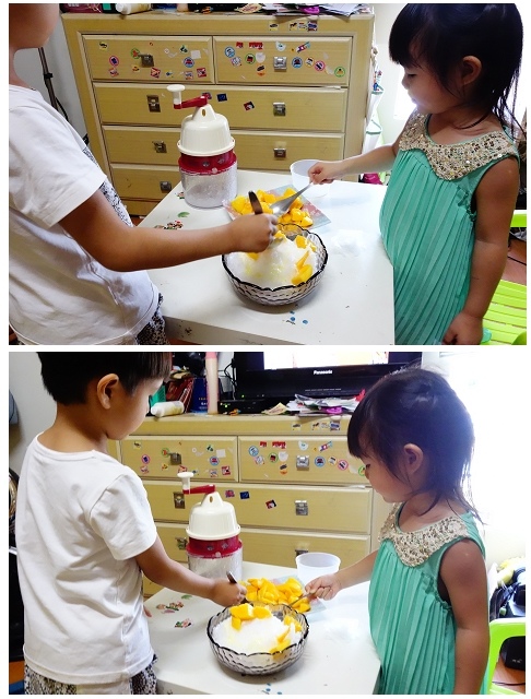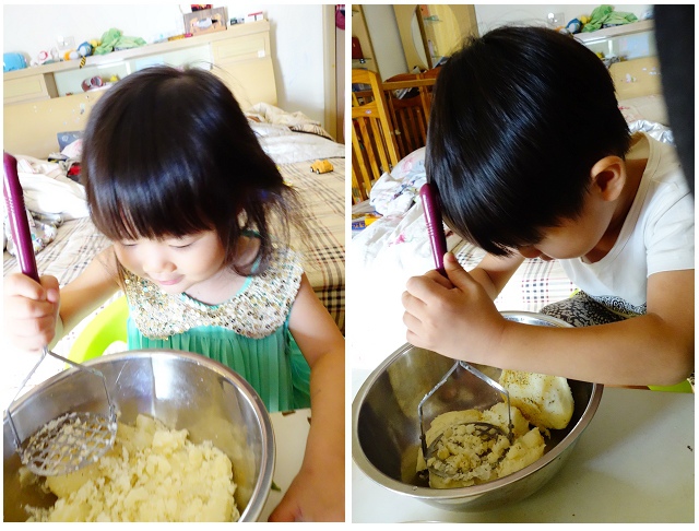 這次兩小跟媽媽一起完成了馬鈴薯沙拉跟芒果冰