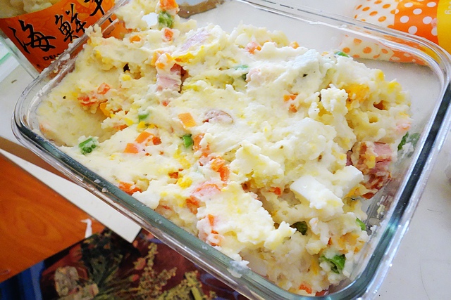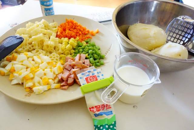 材料:蒸熟的馬鈴薯、蛋、義大利麵、紅蘿蔔丁、四季豆丁、德國香腸丁、鮮奶、沙拉醬、義大利香料