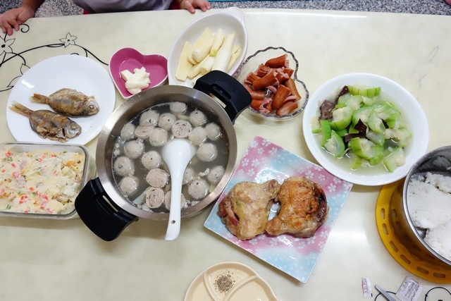 煎雞腿肉、煎肉魚、燙德國香腸、炒絲瓜、涼拌筊白筍、馬鈴薯沙拉、貢丸湯