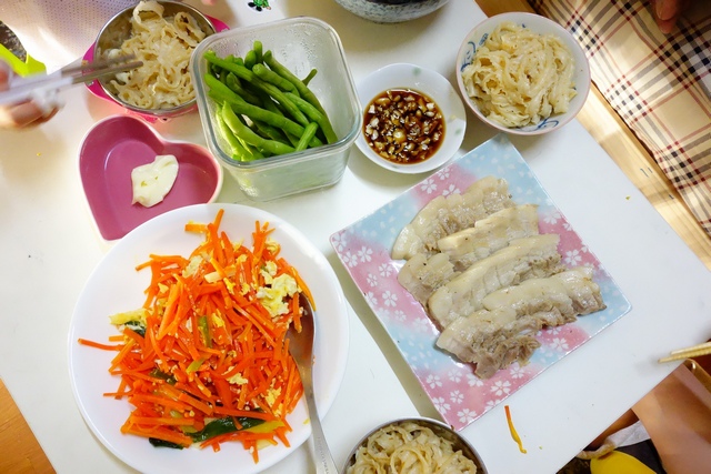 蒜蓉白肉、紅蘿蔔炒蛋、涼拌四季豆、沙茶拌麵