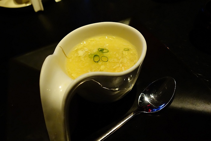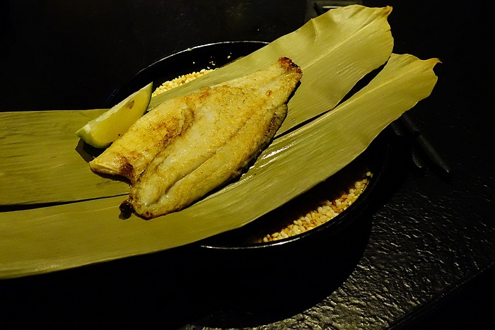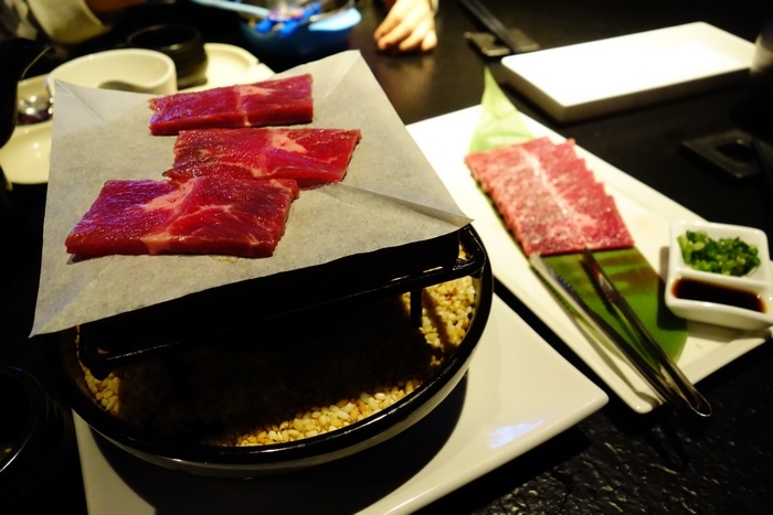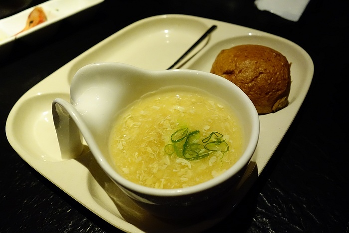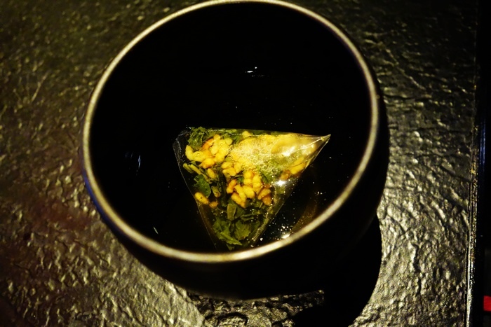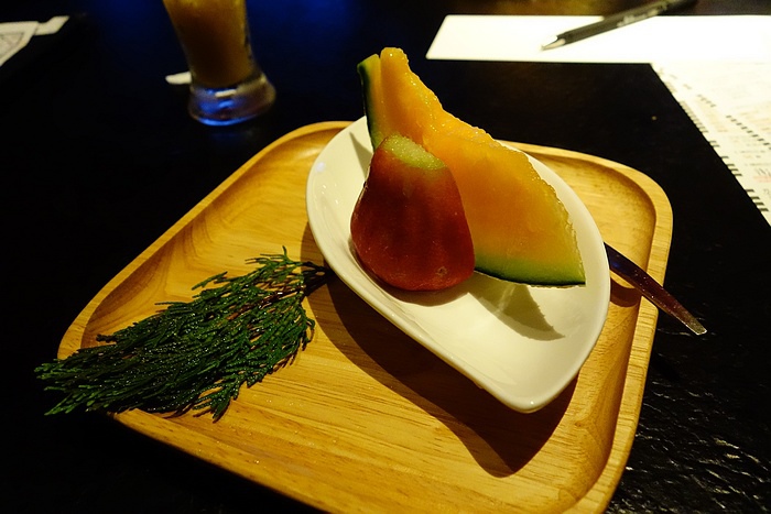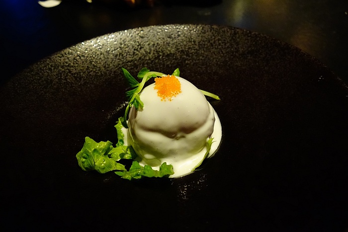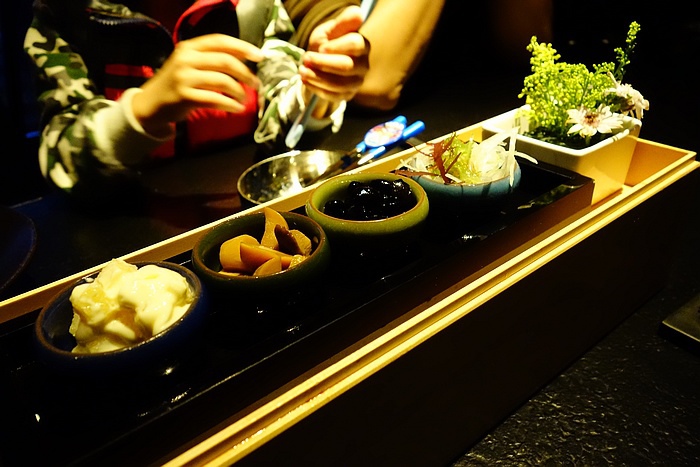 小菜,由右到左是魚卵、杏鮑菇、黑豆、海菜