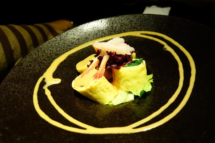 先付:甜蝦時蔬卷(上)、燻鮭魚蕃茄沙拉