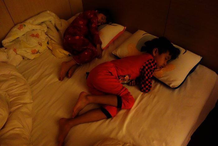 這樣薄薄的連身睡衣加上薄被子就夠兩個小孩睡暖暖