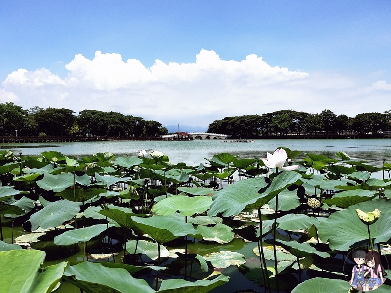 碧綠的湖水、蔚藍的天空與綠葉上的一抹粉紅