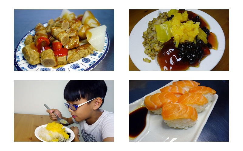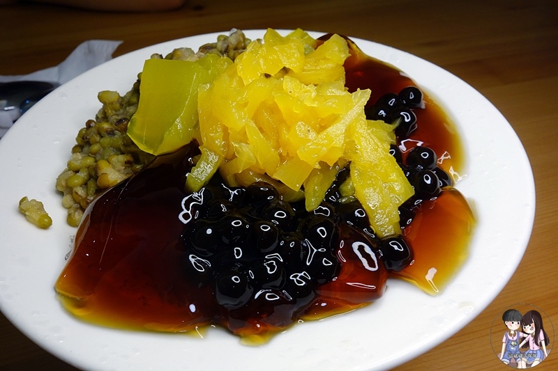 裡面有綠豆、鳳梨、黑糖凍、粉粿跟珍珠