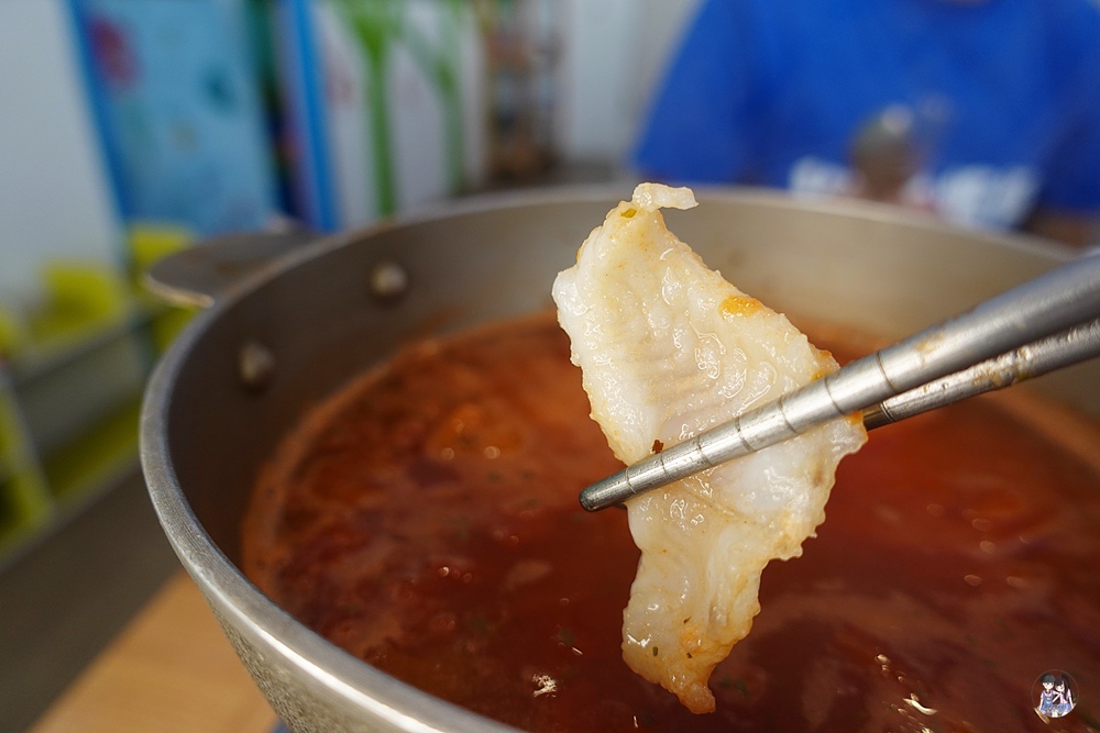 在蕃茄鍋裡煮熟的魴魚肉吃起來好嫩