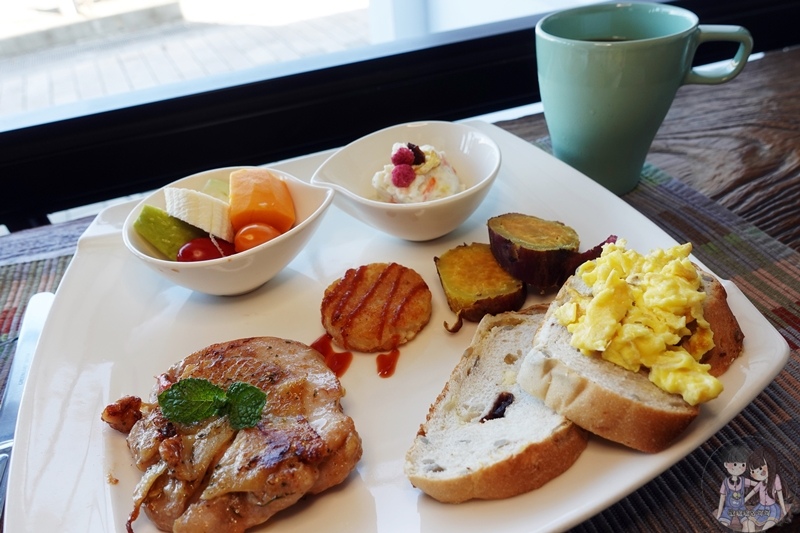 有烤麵包、煎嫩蛋、雞腿排、蒸地瓜、薯餅、馬鈴薯泥跟水果