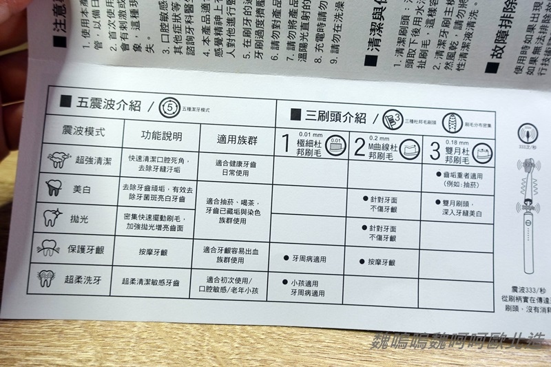 說明書上也很詳細的告知刷頭與各種震波的搭配