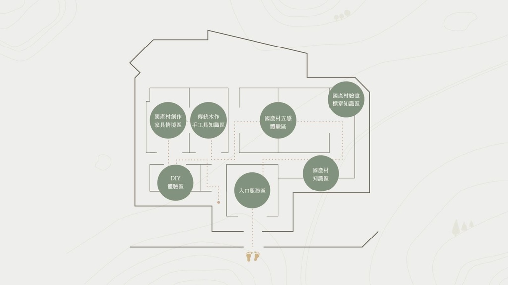 入口服務區、國產材知識區、國產材驗證標章知識區、 國產材五感體驗區、